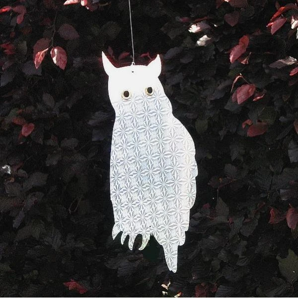 De uilen zijn holografische imitaties met een zeer groot schittering-effect om vogels af te schrikken. Wappert in de wind en schittert in de zon.
